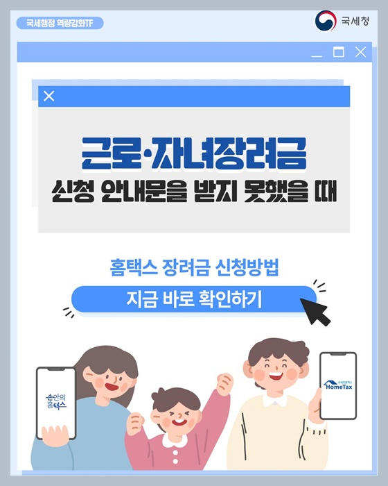 홈택스 전체메뉴 → 장려금·연말정산·기부금 → 근로·자녀장려금 정기 신청 → 안내대상자 여부 조회