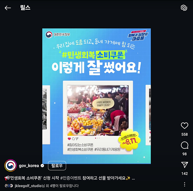2025년 7월, 대한민국 정부가 ‘민생회복 소비쿠폰’ 사용을 장려하고 지역경제 활성화를 위해 인스타그램 인증 이벤트를 진행합니다!