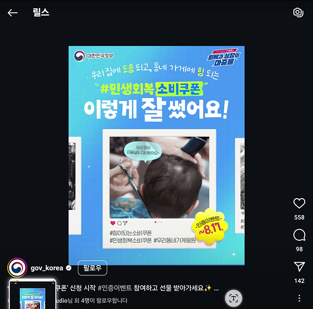 - 대한민국 정부 인스타그램(@gov_korea)채널을 팔로우한 후