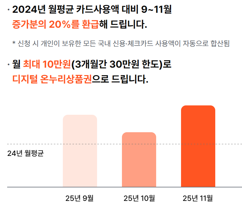 작년 한 해의 카드 월평균 사용액과 비교해서 올해(2025년) 9월부터 11월까지 더 쓴 금액의 20%를 돌려주는 제도입니다.