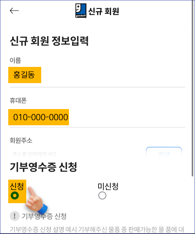 4. 신규회원 가입을 위해 이름, 휴대폰등 개인정보를 입력하시고 기부영수증 신청을 꼭 체크하세요.