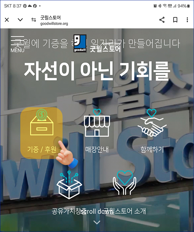 1. 굿윌스토어 홈페이지 접속 후 기증 / 후원을 클릭합니다.