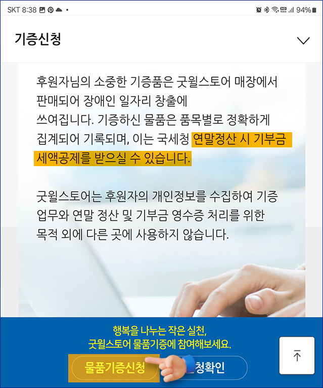 2. 물품기증신청을 클릭(연말정산 시 기부금 세액공제를 받으실 수 있다고 합니다.)