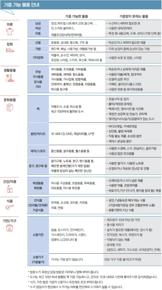 ● 다양한 품목 기증 가능: 의류뿐만 아니라 신발, 잡화, 생활용품, 도서 등 다양한 물품을 기증할 수 있습니다.