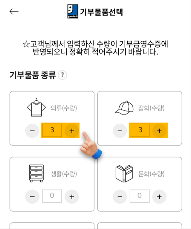 5. 기부물품의 종류와 수량을 체크하세요. 의류 외에도 종료가 많습니다.