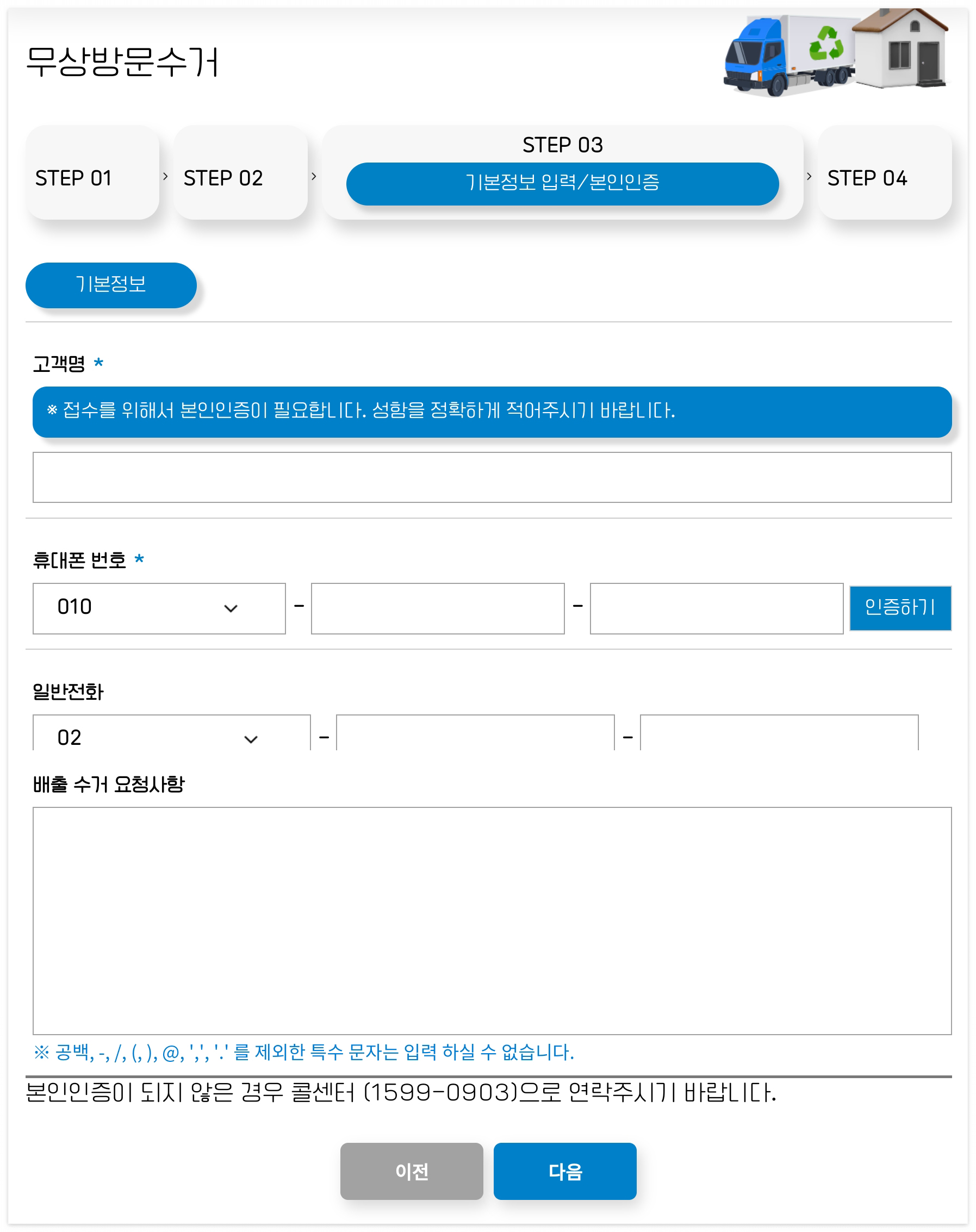 3. 기본정보 입력/ 본인인증: (무상방문수거 STEP 03단계) *표 항목은 필수로 입력하셔야 다음단계로 넘어갈 수 있습니다.