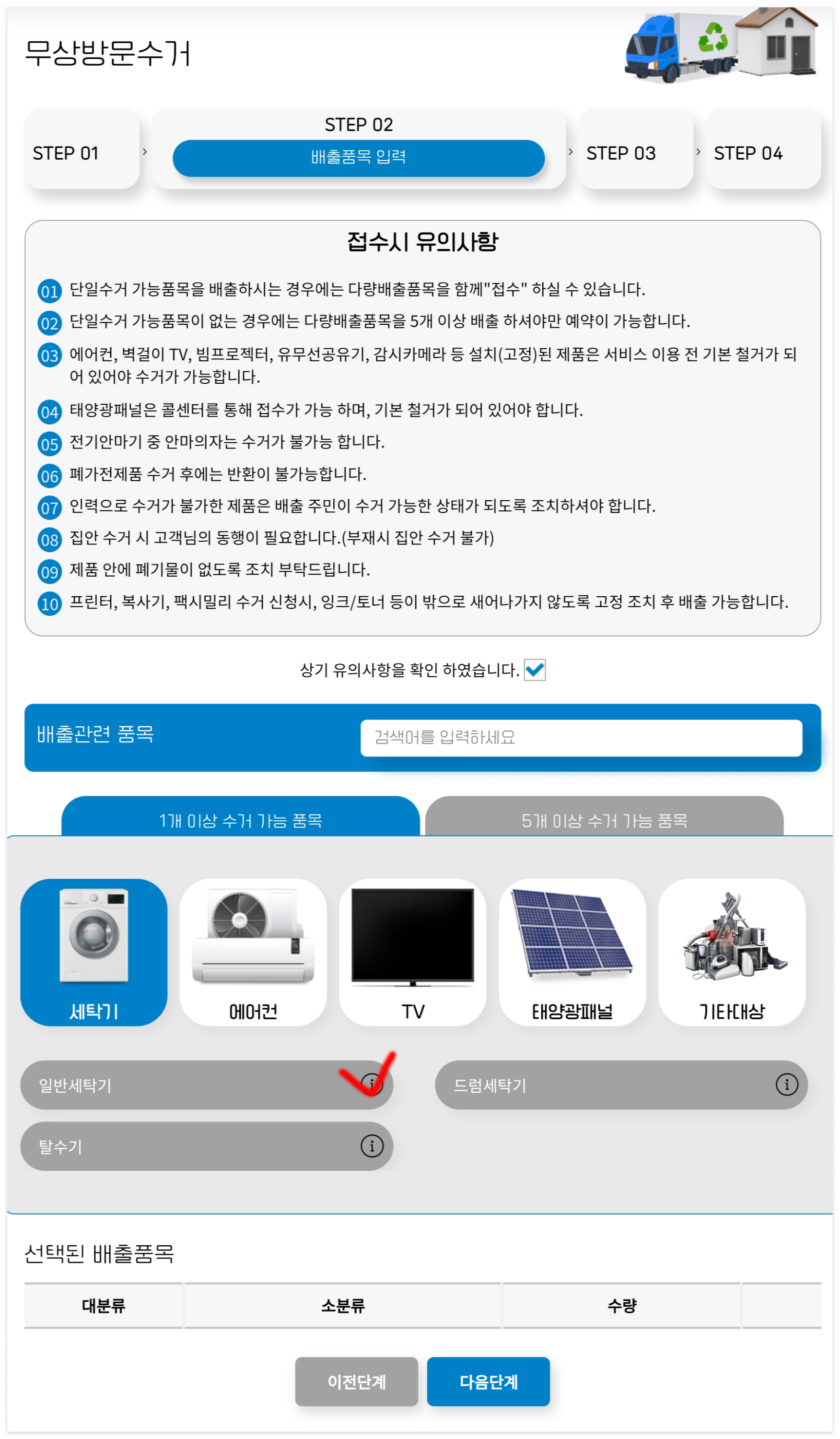 2. 배출품목 입력: (무상방문수거 STEP 02단계) - 배출품목을 체크하세요.