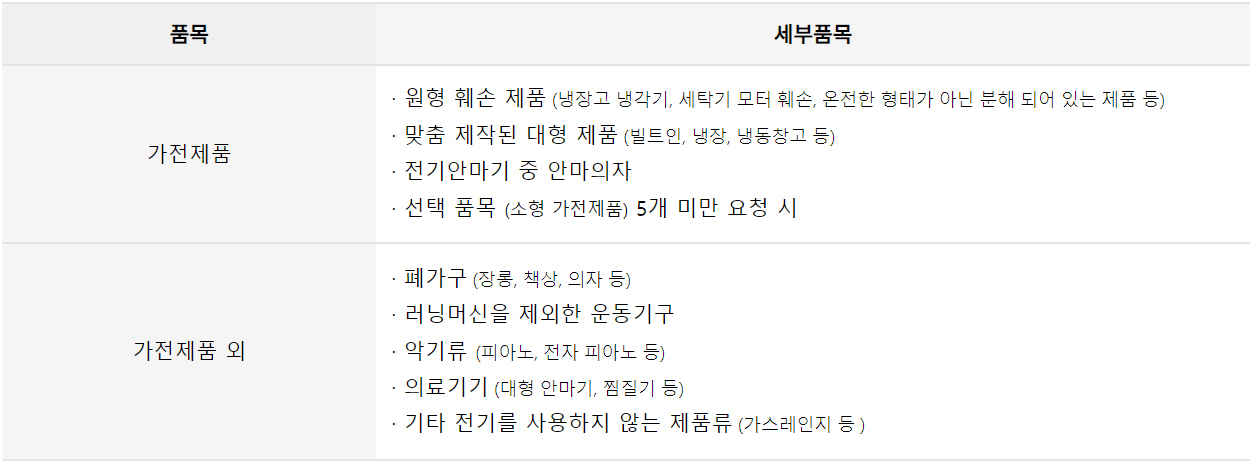· 에어컨, 벽걸이 TV, 빔프로젝터, 유무선공유기, 감시카메라 등 설치(고정)된 제품은 서비스 이용 전 기본 철거가 되어 있어야 수거가 가능합니다.