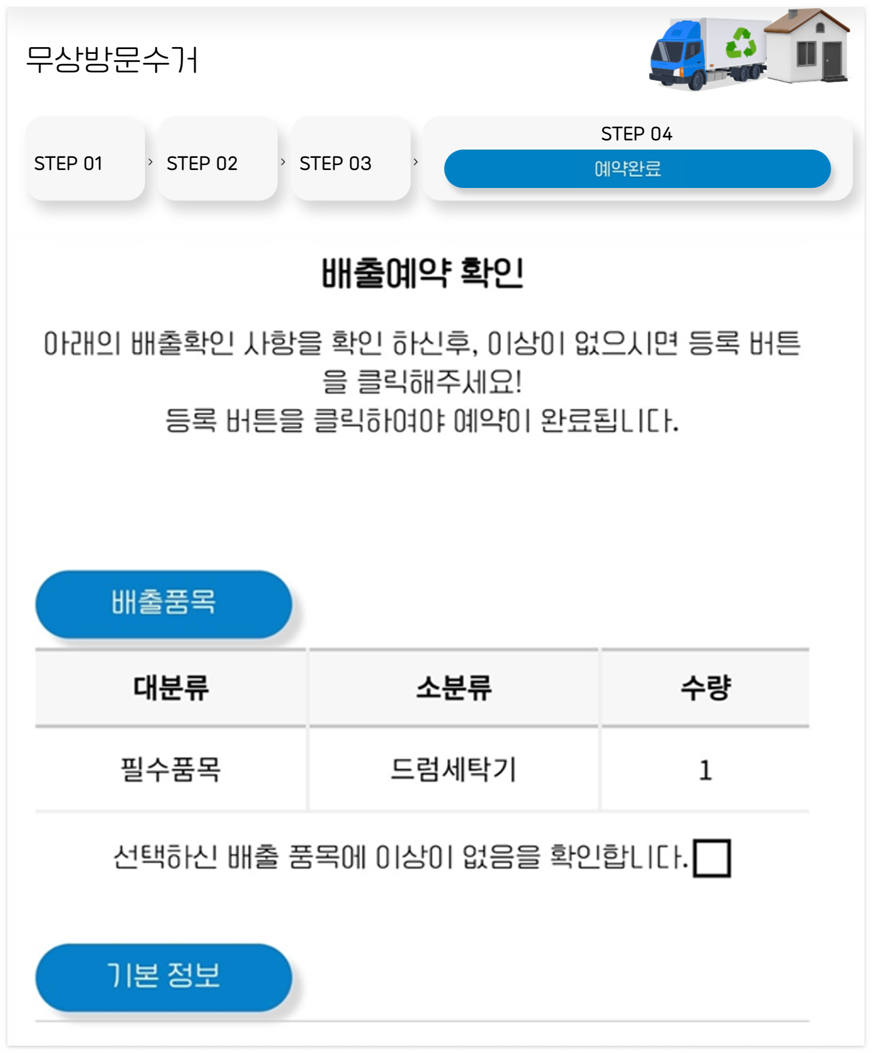 4. 예약완료: (무상방문수거 STEP 04단계) - 배출 품목, 배출희망일 확인합니다. 배출희망일은 지역구별로 일정이 다르니 꼭 선택가능 일자를 확인해 주세요.